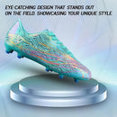 Elevate your soccer game with the Men's Ladera Firm Ground Soccer Cleats - Aqua. A perfect blend of style and performance for adults. The synthetic upper, adorned with a captivating rainbow color print, not only ensures durability but also adds a unique, stylish flair. The cleats are engineered for firm ground surfaces, featuring a molded TPU outsole with round studs that provide stability and maximum traction.